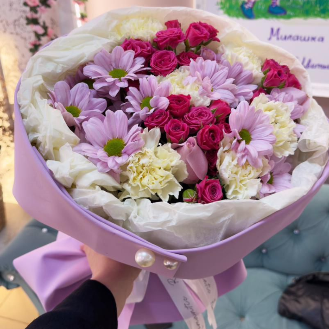 Сборный букет с ромашковидной хризантемой, кустовыми розами и диантусами