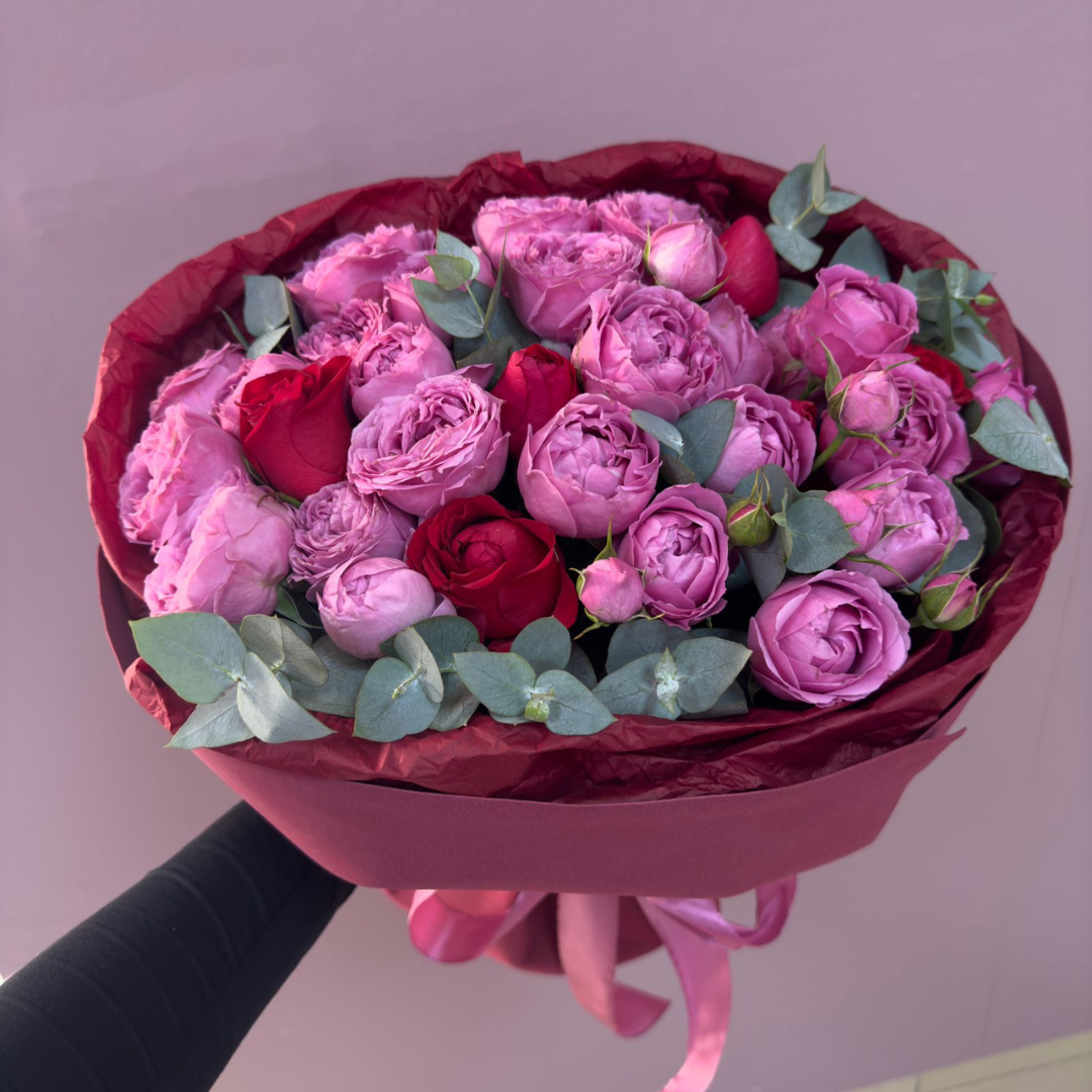 Кустовая пионовидная роза, красные розы и эвкалипт в сборном букете