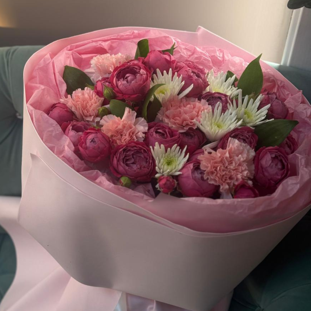 Сборный букет с пионовидными кустовыми розами