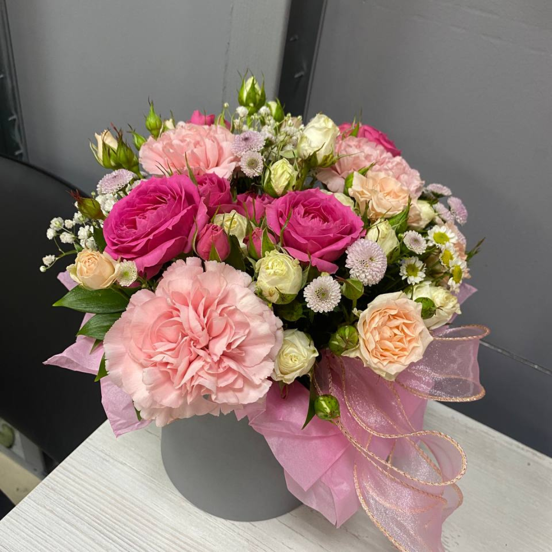 Композиция в шляпной коробке с кустовыми розами, хризантемой, диантусами и гипсофилой