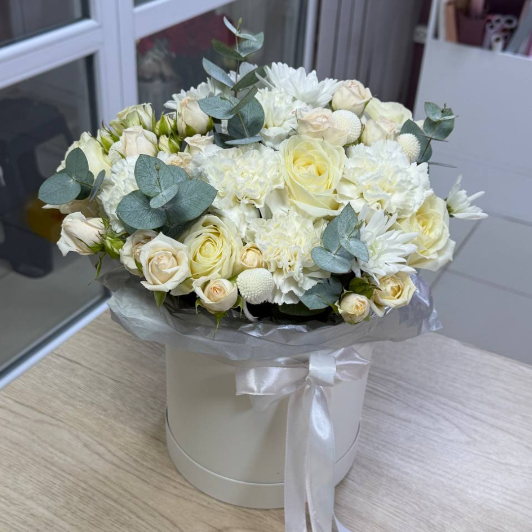 Шляпная коробка в светлых оттенках с эвкалиптом
